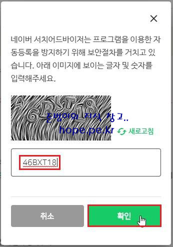 네이버 서치어드바이저는 프로그램을 이용한 자동등록을 방지하기 위해 보안절차를 거치고 있습니다. 아래 이미지에 보이는 글자 및 숫자를 입력해주세요. 창에서, '이미지에 보이는 글자 및 숫자' 입력 후 '확인' 을 클릭 합니다.