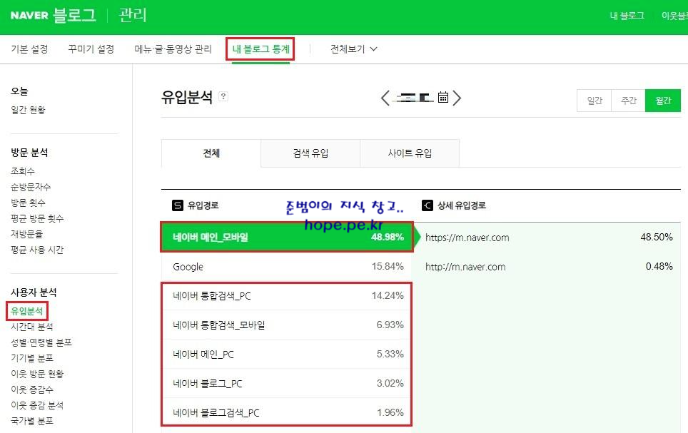 반면 네이버 블로그의 유입경로는 대부분이 네이버 검색을 통한 유입 이네요.