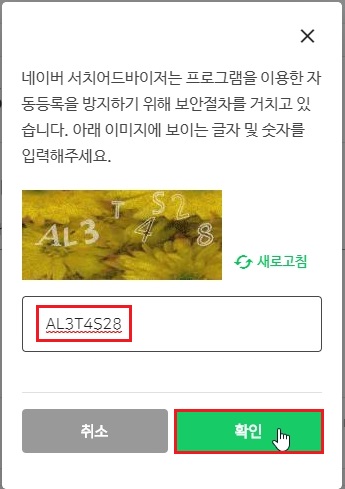 '이미지에 보이는 글자 및 숫자' 입력 후 '확인' 을 클릭 합니다.