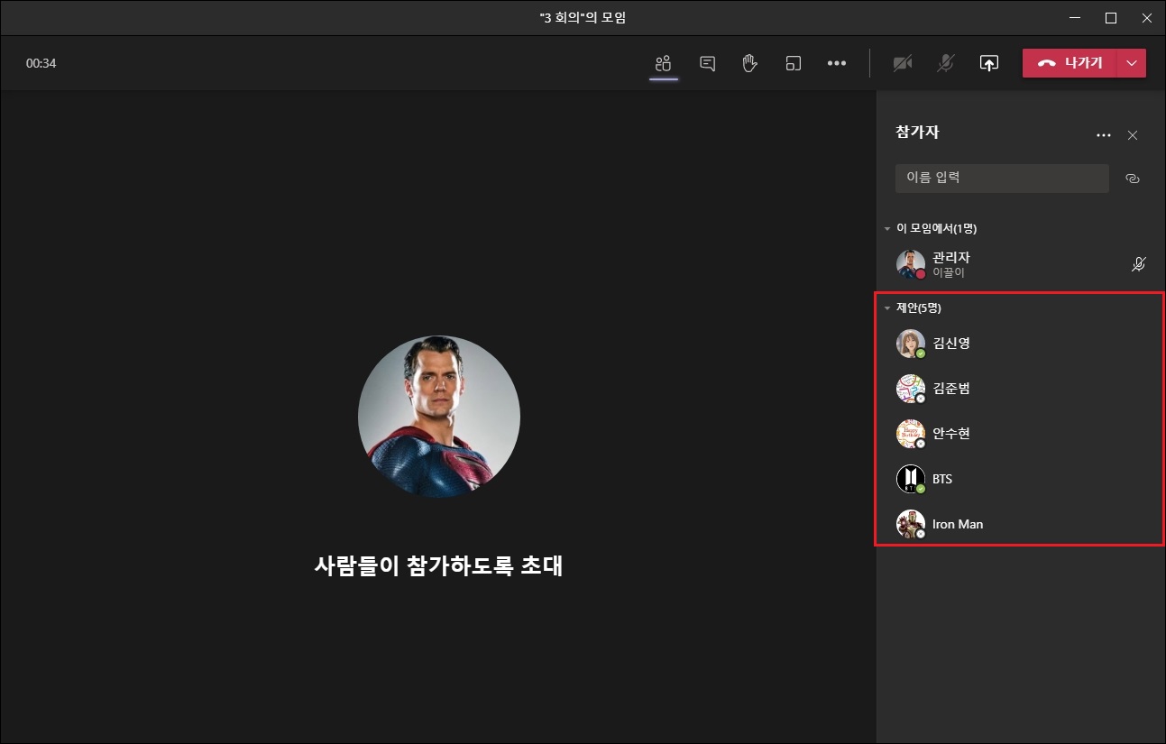 Teams 모임(새모임 환경 설정)에서 사용자 초대하려고 한글 입력 시 자소 분리 현상