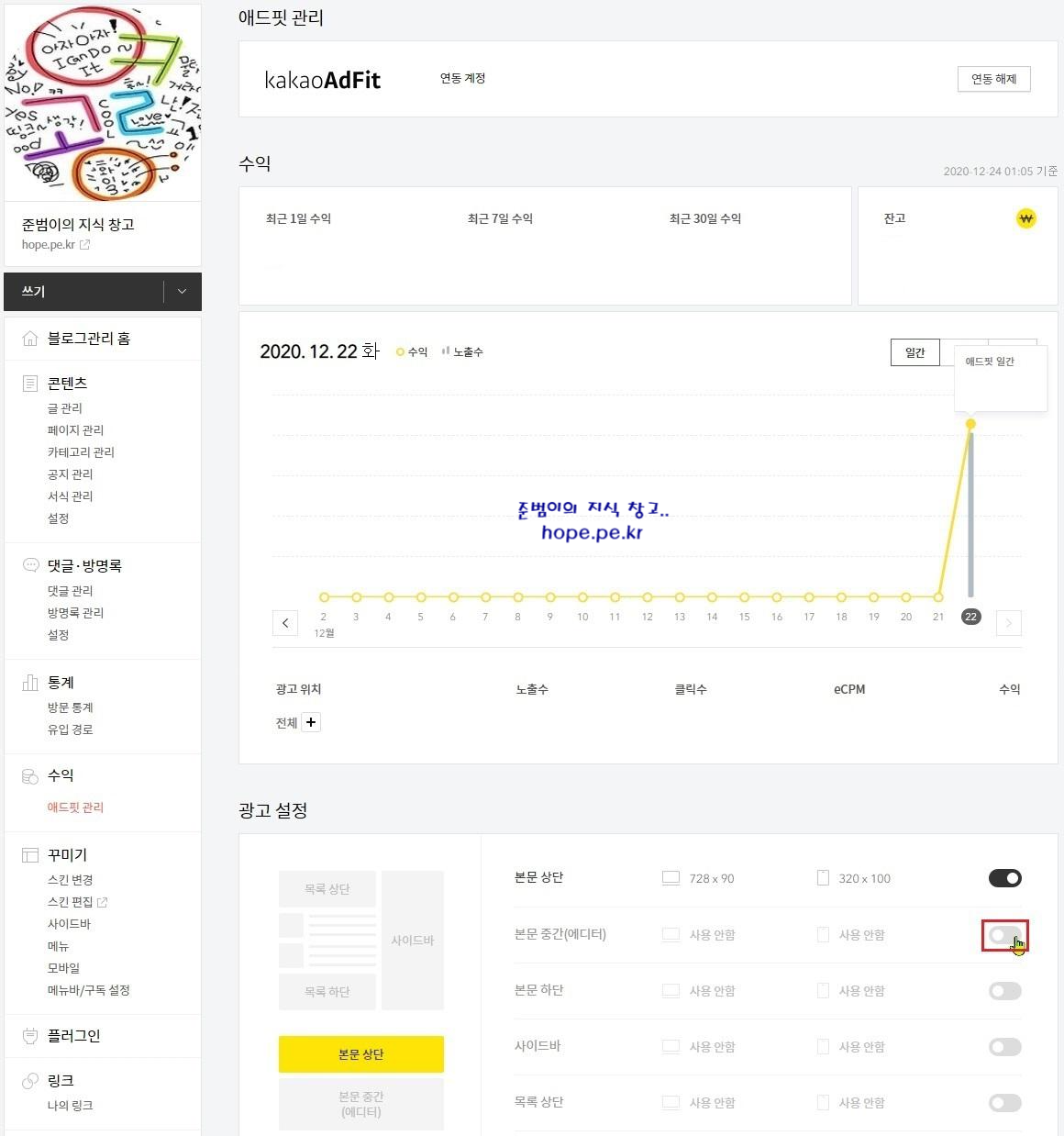 | 티스토리 수익 - 애드핏 본문 중간 광고(에디터) 설정 (0) | 2020.12.25 |