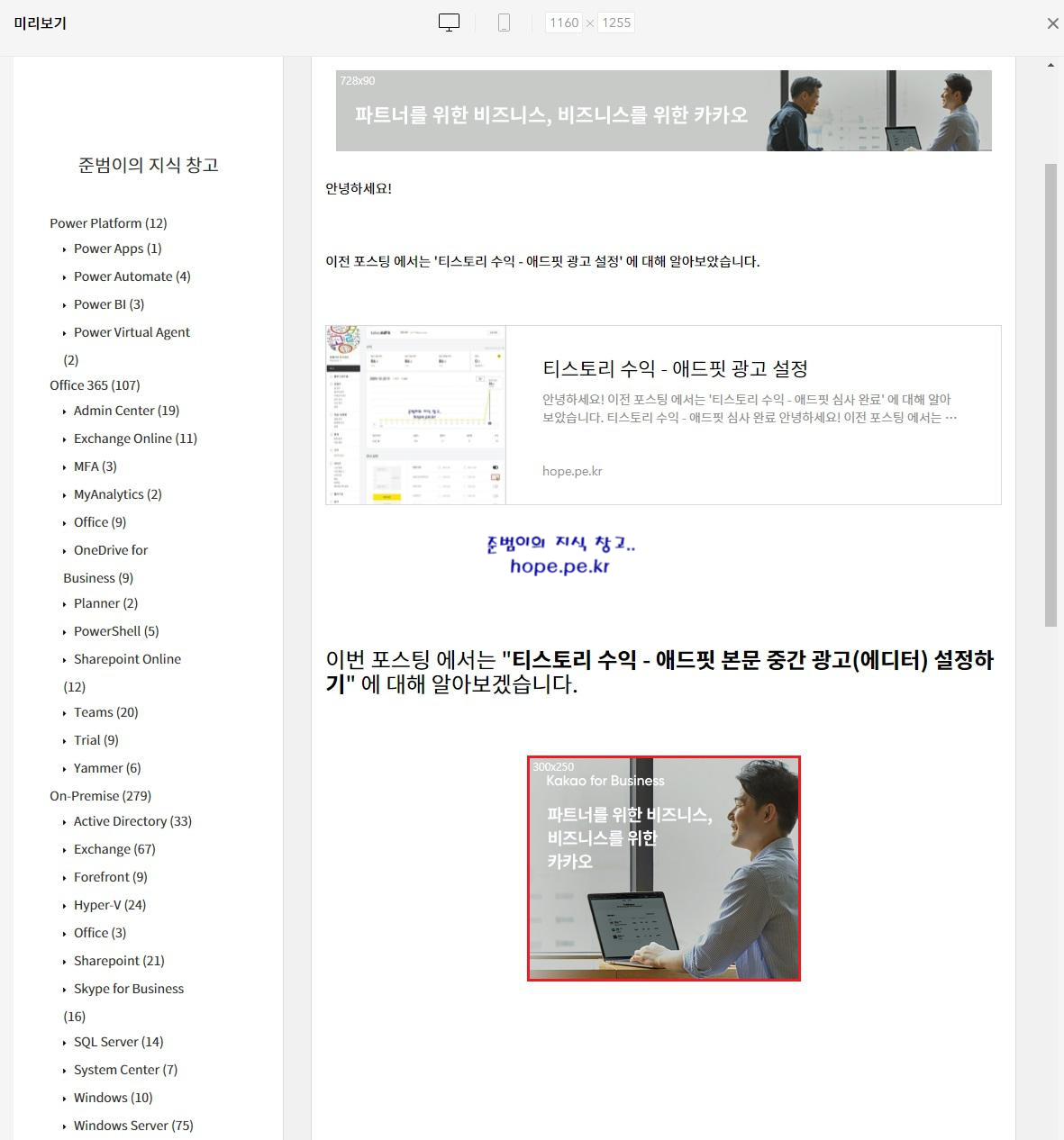 미리보기 화면에서, '애드핏 본문 중간 광고(에디터)' 의 위치를 확인합니다.
