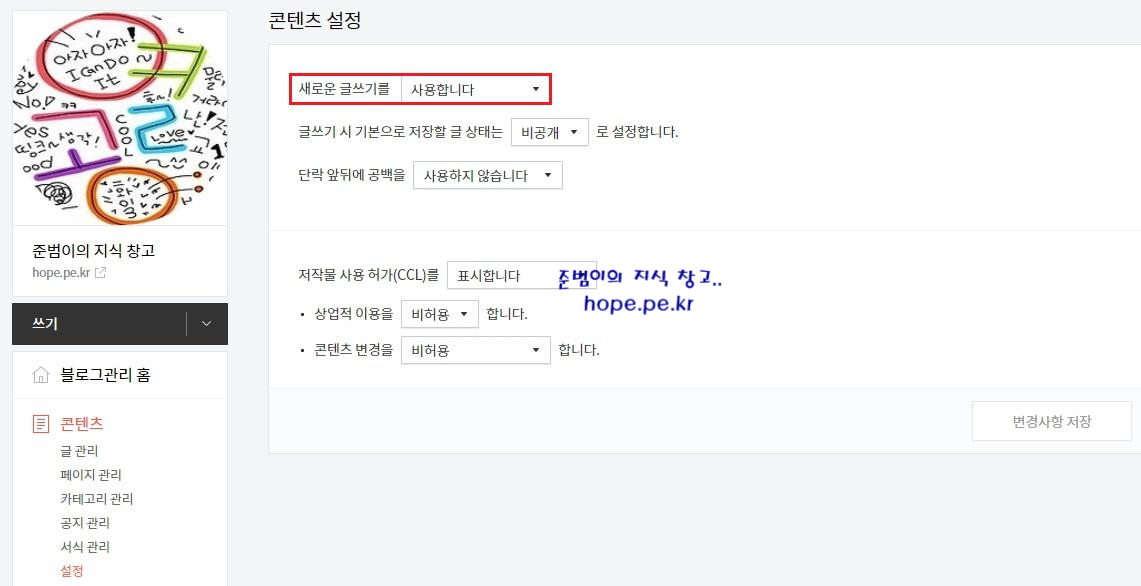 콘텐츠 설정 화면에서, 새로운 글쓰기를 '사용합니다.' 로 설정 되어 있는지 확인합니다. '사용하지 않습니다.'로 설정 되어 있다면 '사용합니다.' 로 변경 합니다.