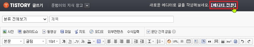 먼저 '애드핏 본문 중간 광고(에디터)'를 사용하기 위해서는 글쓰기 방식이 '새로운 글쓰기' 방식이여야 합니다.