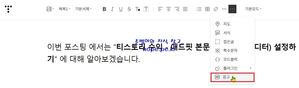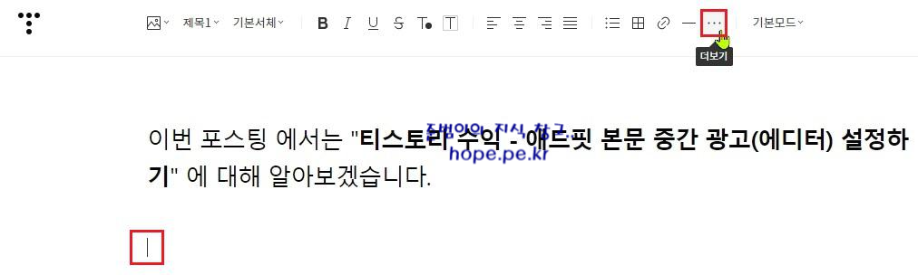 새로운 방식의 글쓰기 에서 광고 삽입을 원하는 위치에 마우스 커서를 위치 시킨 후 의 상단 메뉴 중 '더보기(···)' 를 클릭 합니다.