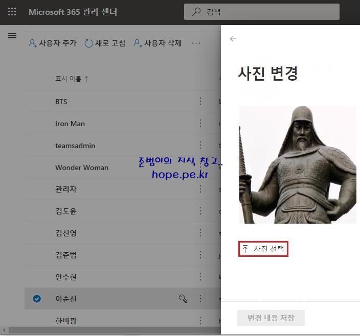 특정 사용자의 사진을 업데이트 하기 위해 Microsoft 관리 센터 에서 '사진 변경' 메뉴를 통해