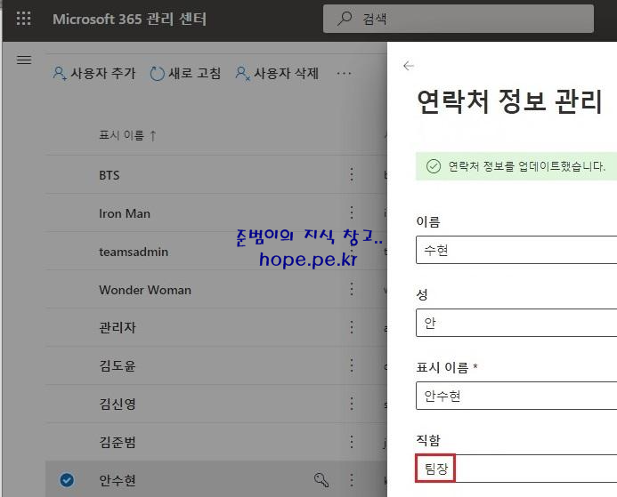 Teams 에는 변경한 직함으로 보이지가 않습니다.