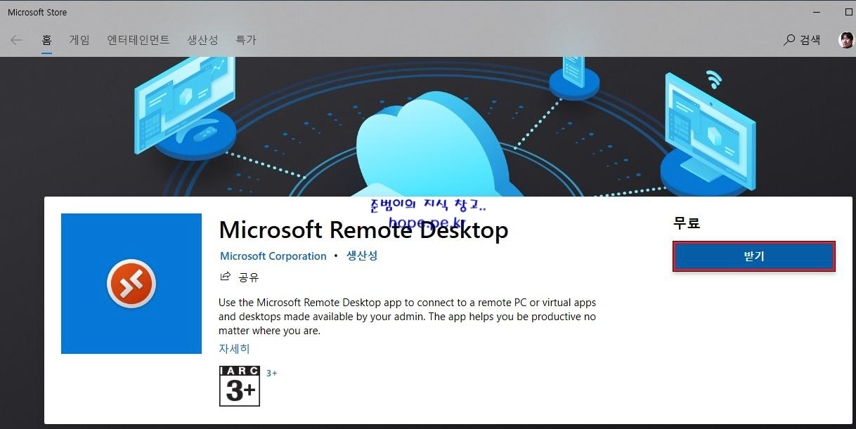 Microsoft Store 창에서, '받기' 를 클릭 하면 Microsoft Remote Desktop 앱이 설치 됩니다. 일정 시간 기다립니다.