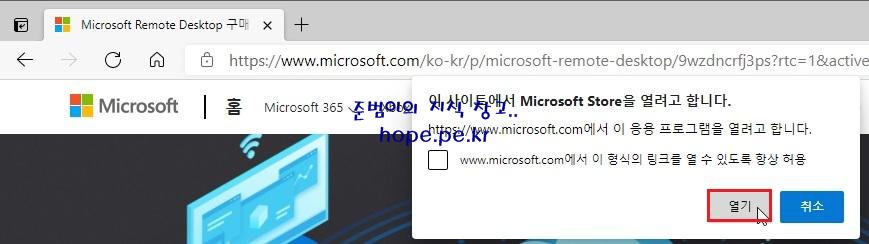 이 사이트에서 Microsoft Store을 열려고 합니다.' 창에서, '열기' 를 클릭 합니다.