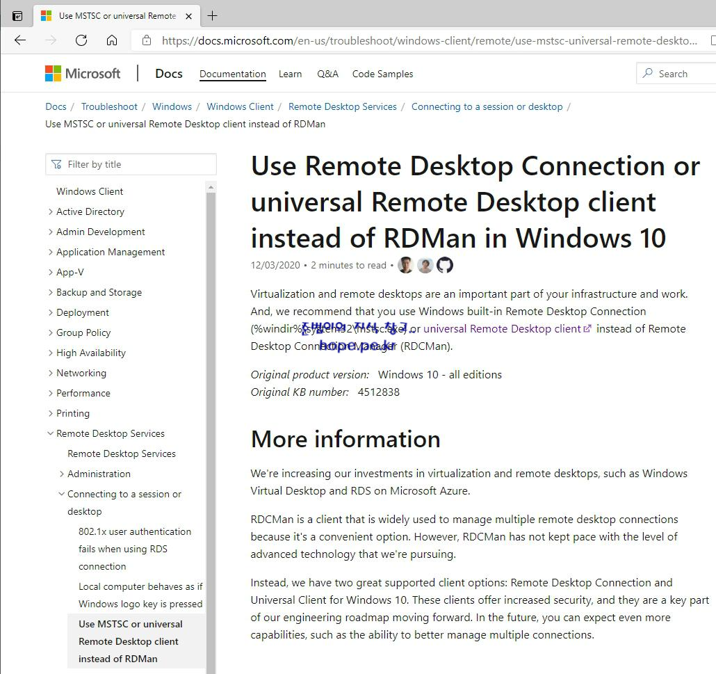 안녕하세요! 이번 포스팅 에서는 "Remote Desktop Connection Manager (RDCMan, 원격 데스크톱 매니저) 서비스 중단" 에 대해 알아보겠습니다. 지난 3월10일에, Microsoft Security Response Center (MSRC) 에 Rem..