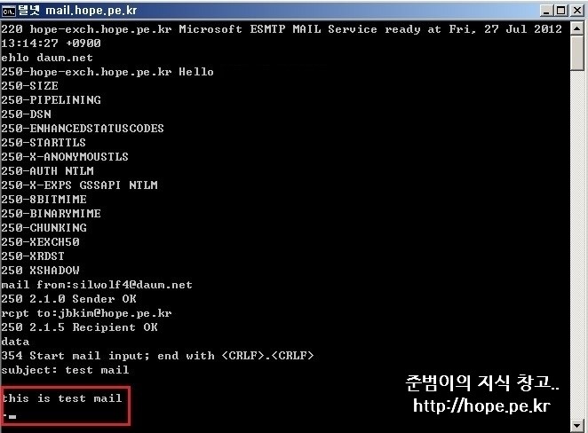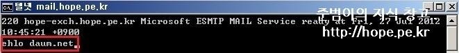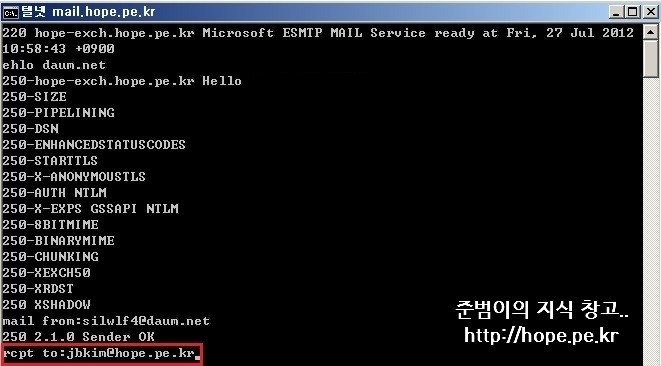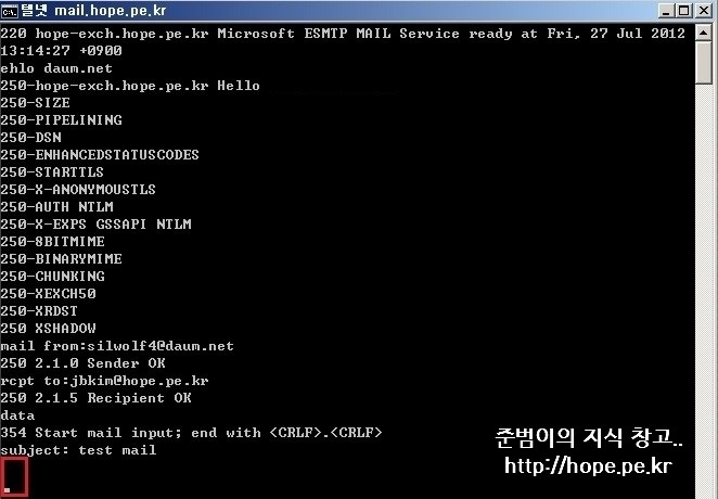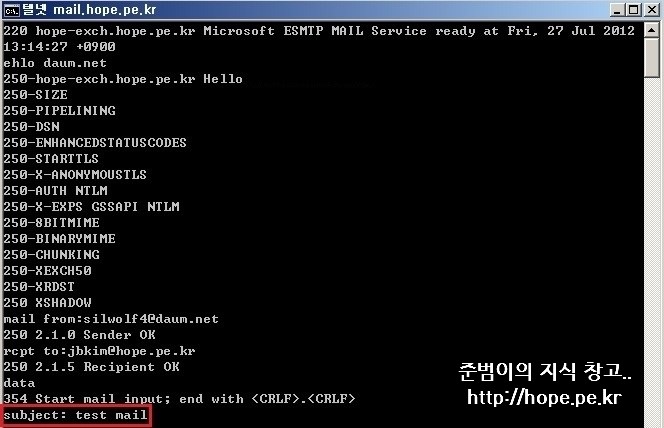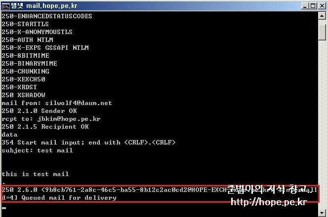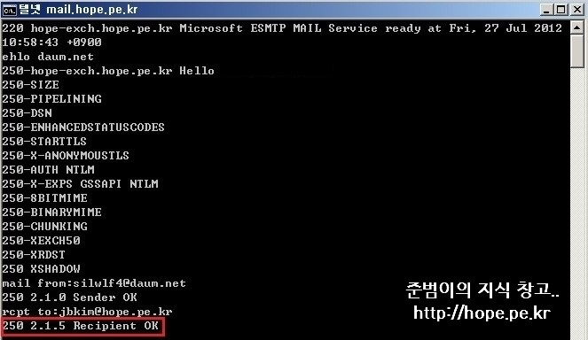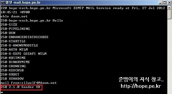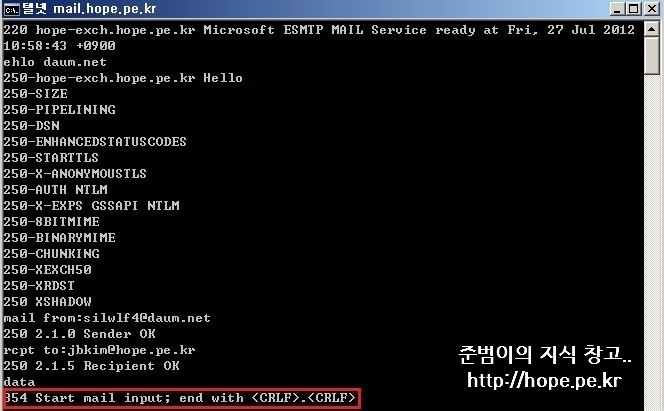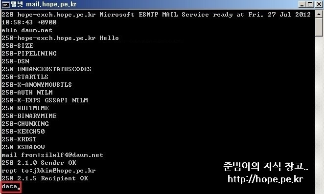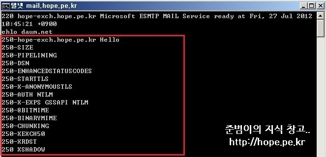 cf) 위의 예는 Exchange Server 의 응답 입니다. 타 벤더사의 SMTP 서버에서는 다른 유형의 응답이 나타날 수 있습니다.