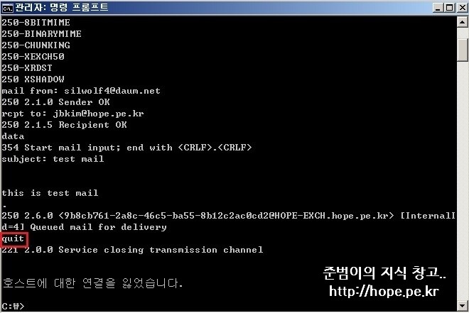 15. quit 명령어로 정상적으로 STMP 통신 테스트를 완료 하였습니다.