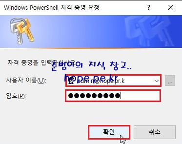 Windows PowerShell 자격 증명 요청 창에서, '사용자 이름', '암호' 입력 후 '확인' 을 클릭 합니다.