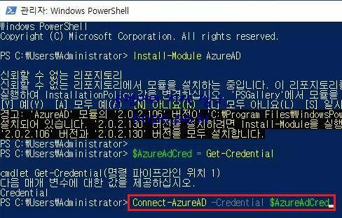 'Connect-AzureAD -Credential $AzureAdCred' 명령어를 실행 합니다.