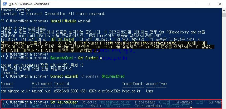 'Set-AzureADUser -ObjectId "이메일 주소" -DisplayName "표시 이름" -GivenName "이름" -Surname "성" -JobTitle "직함" -Department "부서 이름" -Mobile "핸드폰 번호" -TelephoneNumber "전화 번호"' 명령어를 실행 합니다.
