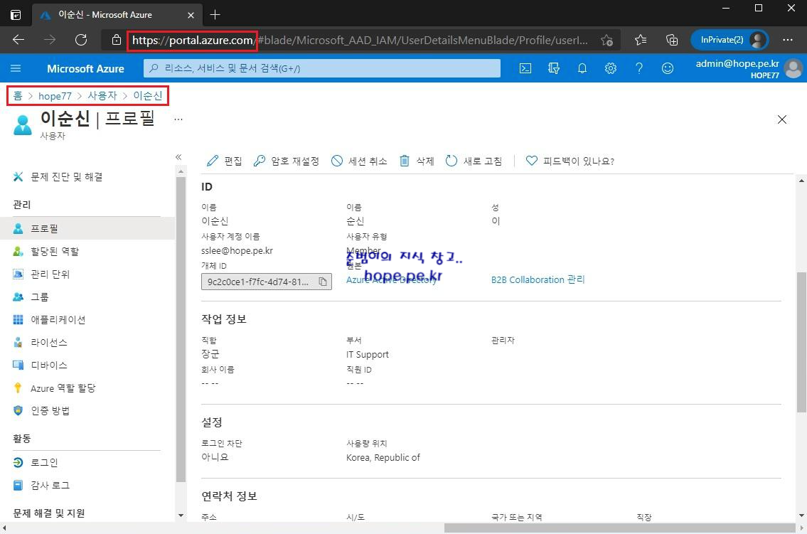 'Azure Active Directory > 조직 > 사용자 > 해당 사용자' 에서, 사용자 속성이 정상적으로 수정 되었음을 확인 합니다.