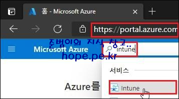 Azure Portal 사이트 (https://portal.azure.com) 에서, 'Intune' 검색 후 검색되는 'Intune' 서비스 를 클릭 합니다.