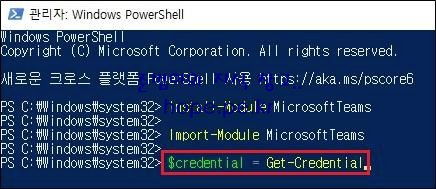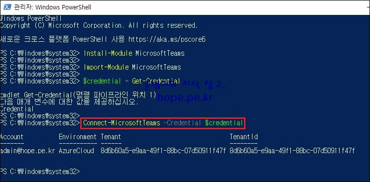 'Connect-MicrosoftTeams -Credential $credential' 명령어를 실행 합니다.