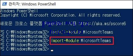 'Import-Module MicrosoftTeams' 명령어를 실행 합니다.