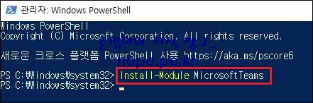Windows PowerShell을 관리자 권한으로 실행 후 'Install-Module MicrosoftTeams' 명령어를 실행 합니다.