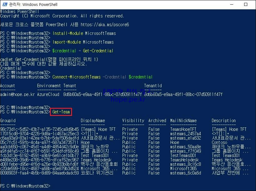 정상적으로 Teams PowerShell에 연결 되었습니다. ^^