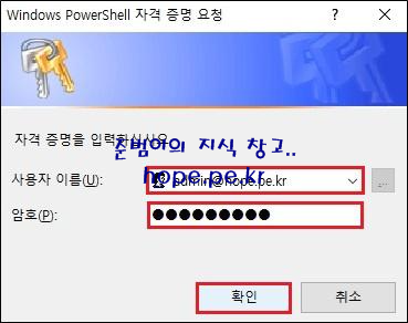 Windows PowerShell 자격 증명 요청 창에서, '사용자 이름' 입력 후 '암호' 입력 후 '확인' 을 클릭 합니다.