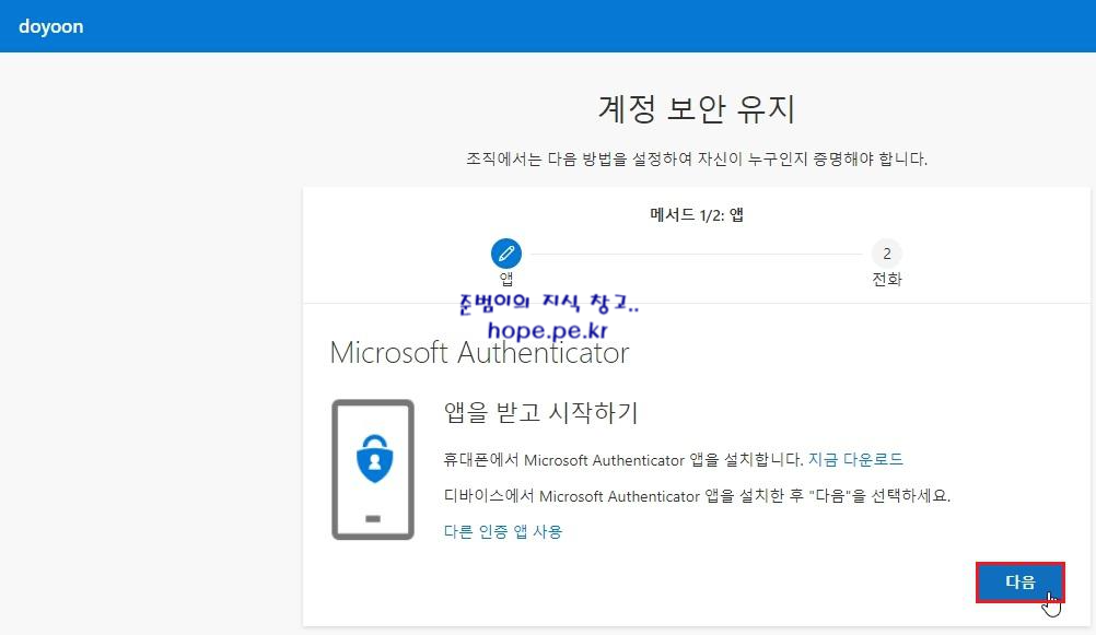 계정 보안 유지 - 앱을 받고 시작하기 화면에서, '다음' 을 클릭 합니다.