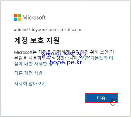 Office 365 로그인 시 계정 보호 지원 메세지 발생 후 14일이 경과하면 '지금은 건너뛰기' 버튼이 사라지고 반드시 계정 보호 지원 설정을 해야 합니다.