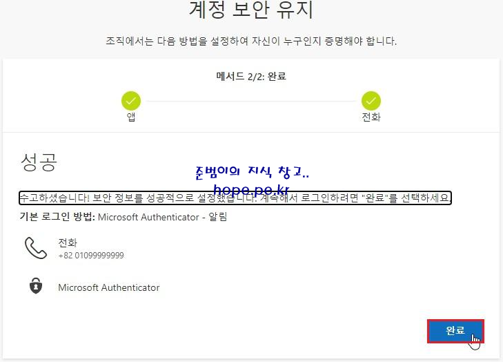 성공 화면에서, '완료' 를 클릭 합니다.