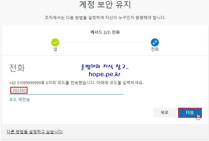 수신한 '확인 코드' 입력 후 '다음' 을 클릭 합니다.