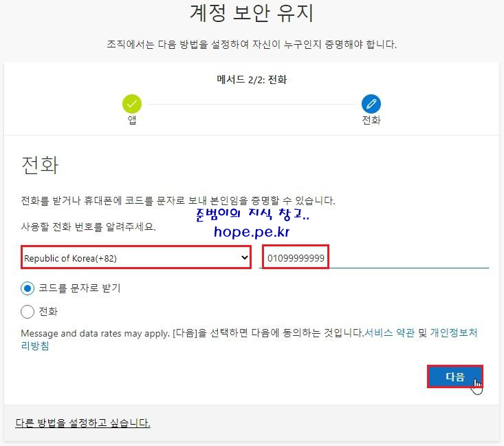전화 화면에서, 'Republic of Korea(+82)' 선택 후 '핸드폰 번호' 입력 후 '다음' 을 클릭 합니다.