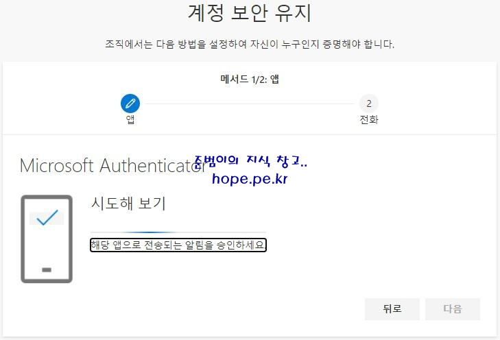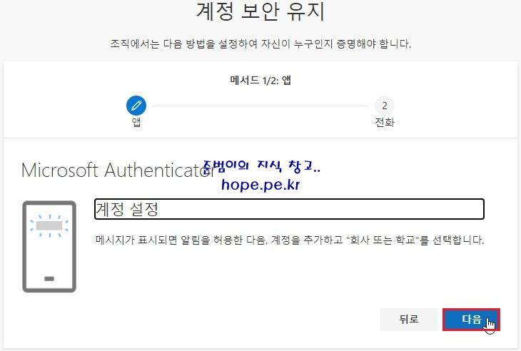 계정 보안 유지 - 앱을 받고 시작하기 화면에서, '다음' 을 클릭 합니다.
