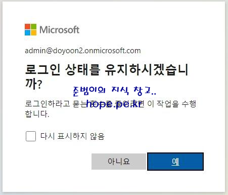 로그인 상태를 유지하시겠습니까? 화면이 발생 합니다. '아니요' or '예' 를 클릭 합니다.