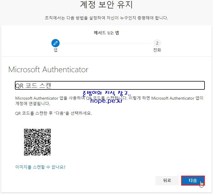 스마트폰으로 QR 코드를 스캔 합니다. 계정이 추가 되면 '다음' 을 클릭 합니다.