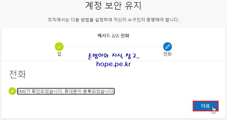 SMS가 확인되었습니다. 휴대폰이 등록되었습니다. 메세지 확인 후 '다음' 을 클릭 합니다.