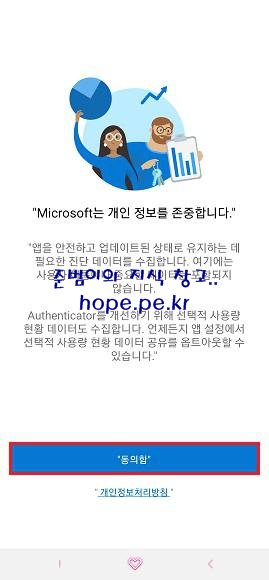 'Microsoft Authenticator' 앱이 실행되면, '동의함' 을 터치 합니다.