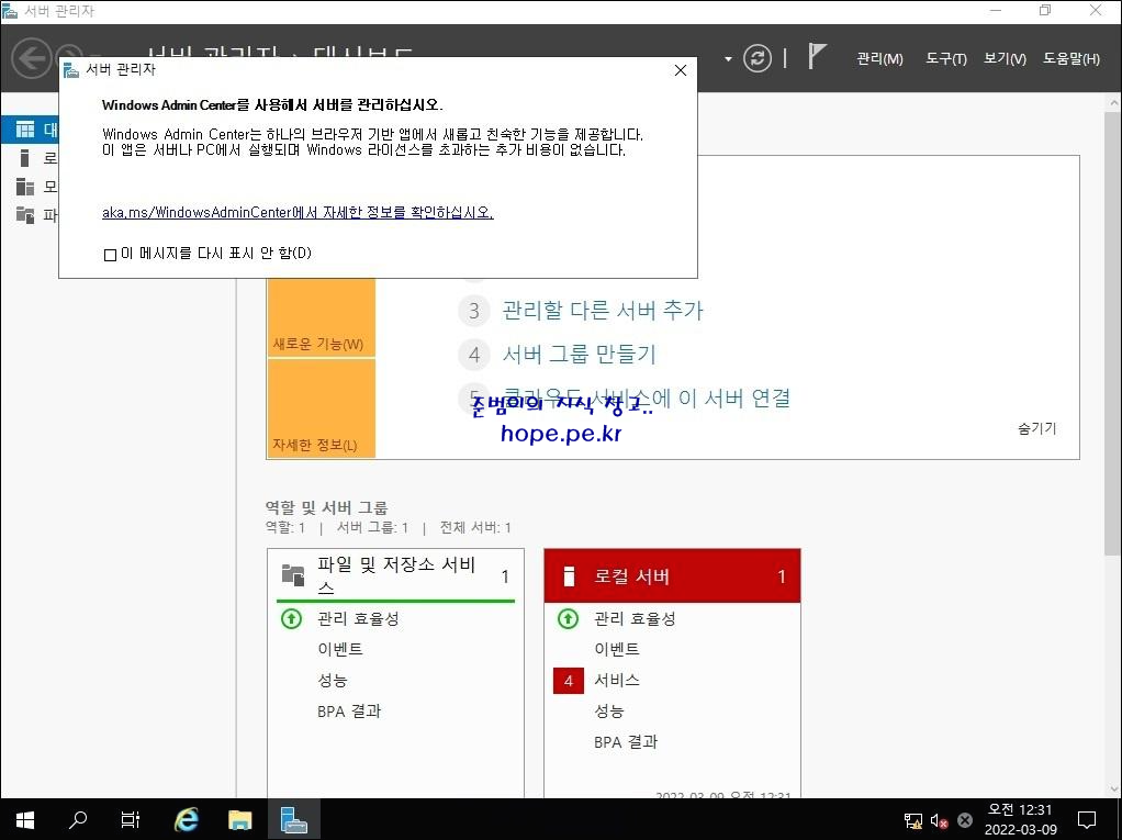 로그인이 되면 서버 관리자 창이 자동으로 실행 되고, 'Windows Admin Center'를 사용해서 서버를 관리하십시오. 팝업창이 발생합니다.