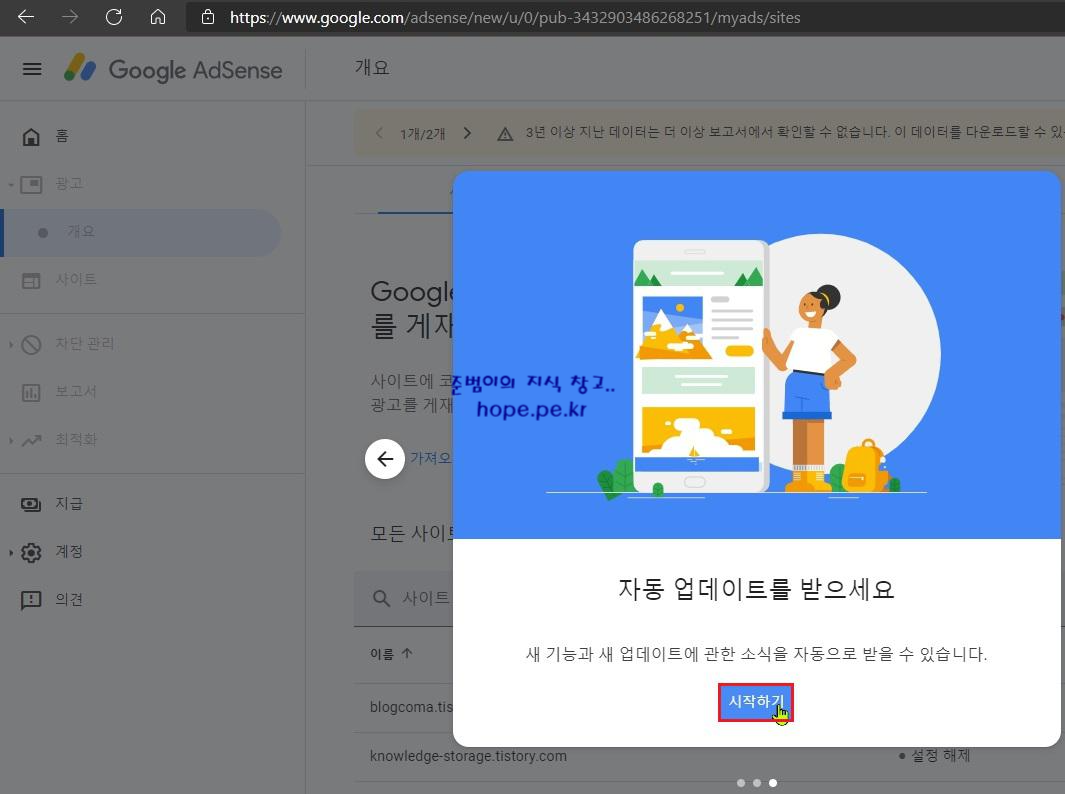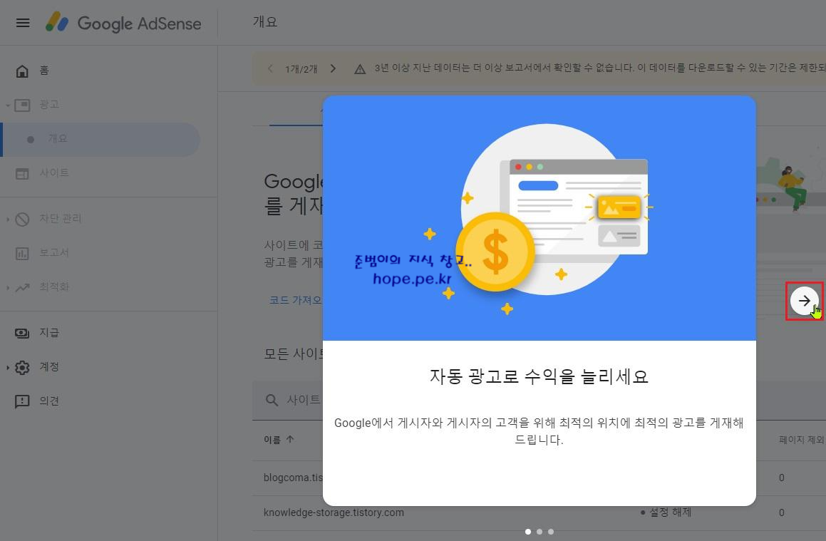 '자동 광고로 수익을 늘리세요' 튜토리얼 화면에서, '→(왼쪽 화살표)' 를 클릭 합니다.