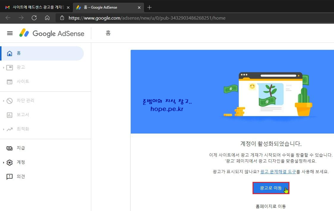 Google AdSense 홈 페이지에서, '광고로 이동' 을 클릭 합니다.