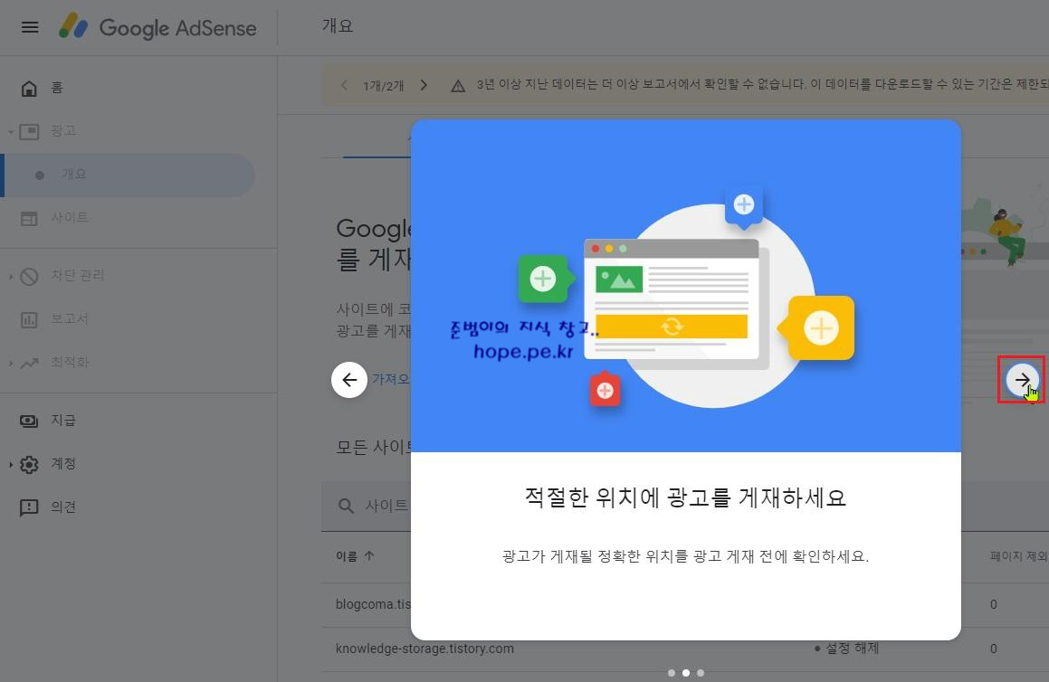 '적절한 위치에 광고를 게재하세요' 튜토리얼 화면에서, '→(왼쪽 화살표)' 를 클릭 합니다.