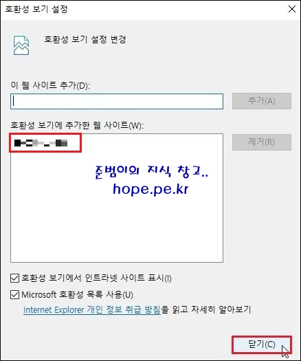호환성 보기에 추가한 웹 사이트에 정상 등록됨을 확인후 '닫기' 를 클릭 합니다.