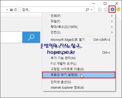 Internet Explorer 우측상단의 '도구 > 호환성 보기 설정' 을 클릭 합니다.