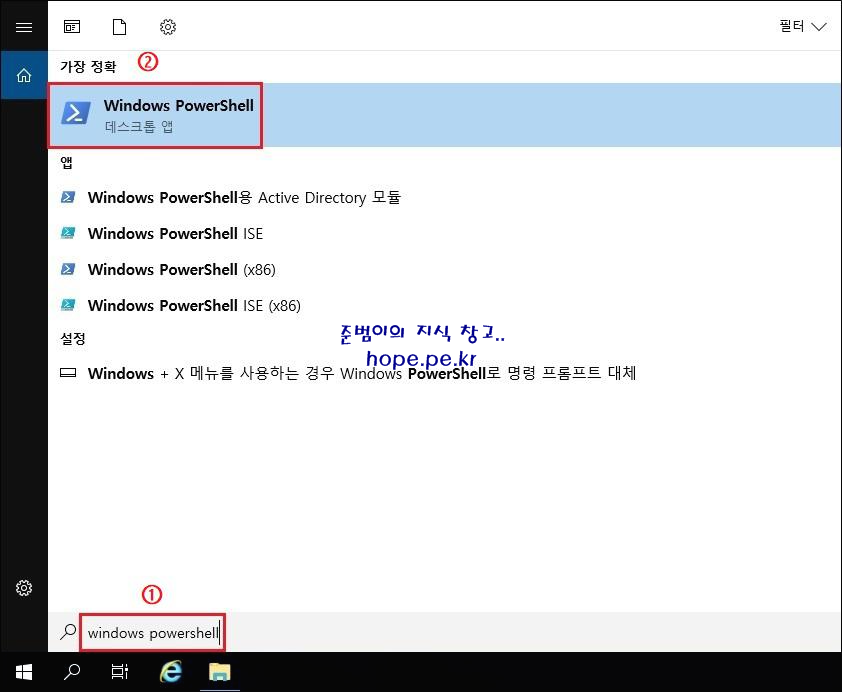 검색박스에서 'windows powershell' 입력후 검색되는 'Windows PowerShell' 을 클릭하여 실행 합니다.