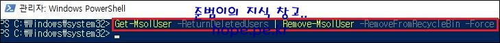 ex) Remove-MsolUser -UserPrincipalName test2@hope4444.onmicrosoft.com -RemoveFromRecycleBin