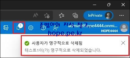 사용자가 영구적으로 삭제됨 메세지를 확인 합니다.