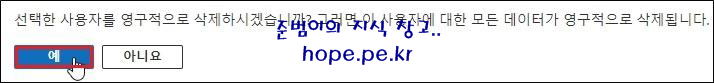 선택한 사용자를 영구적으로 삭제하시겠습니까? 그러면 이 사용자에 대한 모든 데이터가 영구적으로 삭제됩니다. 메세지 창에서, '예' 를 클릭 합니다.