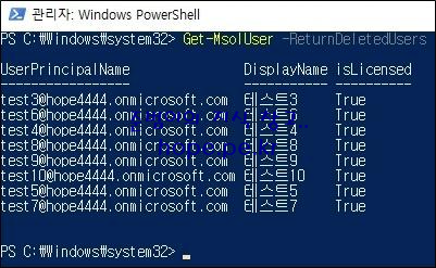 그리고 다음 cmdlet 을 실행하여 삭제된 사용자 목록을 확인 합니다.