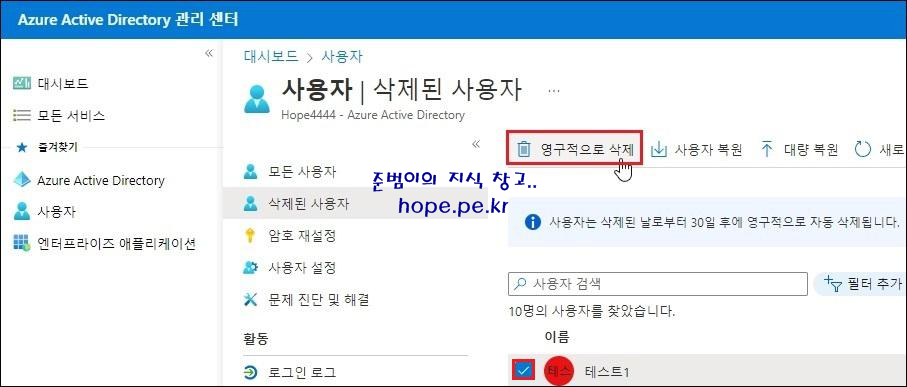 첫번째 방법으로, Azure Active Directory 에서 영구 삭제가 가능 합니다.