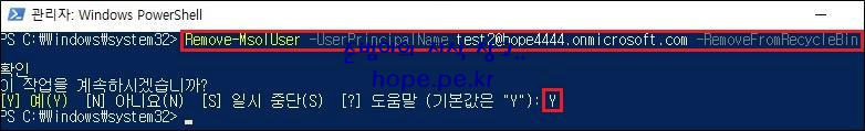 ex) Remove-MsolUser -UserPrincipalName test2@hope4444.onmicrosoft.com -RemoveFromRecycleBin