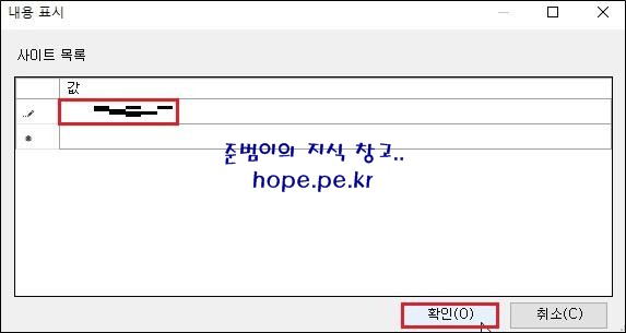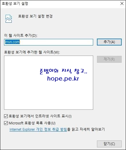 내용 표시 창에서, '호환성 보기 목록에 추가할 사이트 URL' 입력후 '확인' 을 클릭 합니다.